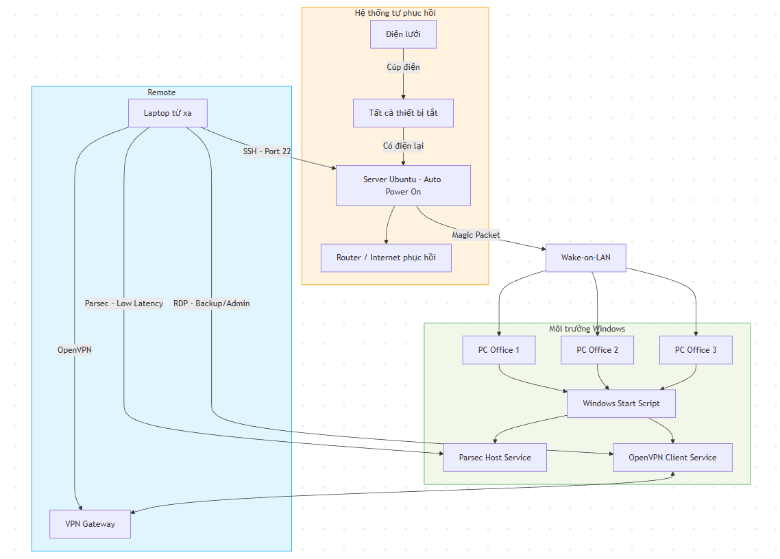 Để hệ thống này chạy mà không tốn tiền điện, tôi tận dụng một con server Linux 24/24 ở công ty. Khi nào cần dùng đến PC Windows ở văn phòng, tôi chỉ cần SSH vào con Linux đó rồi bắn một gói tin qua lệnh wakeonlan. Chỉ cần có địa chỉ MAC của mấy con máy kia là có thể mở được. Cần máy nào thì bật máy đó, làm xong thì tắt, cực kỳ chủ động và tiết kiệm điện cho công ty.